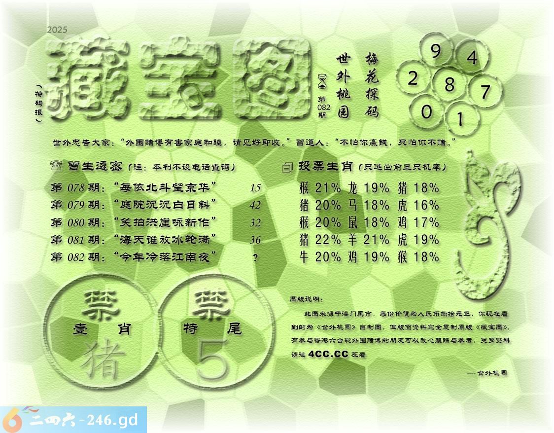 082期藏寶圖 新:丽日疏烟破小春 老:今年冷落江南夜 禁:猪禁:5尾玄機字:《后》