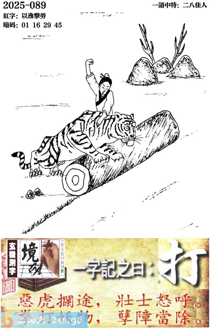 089期跑狗一字記之曰:【打】 惡虎攔途,壯士怒呼。 拳打妖物,孽障當除。 玄機測字:《境》 一語中特:二八佳人