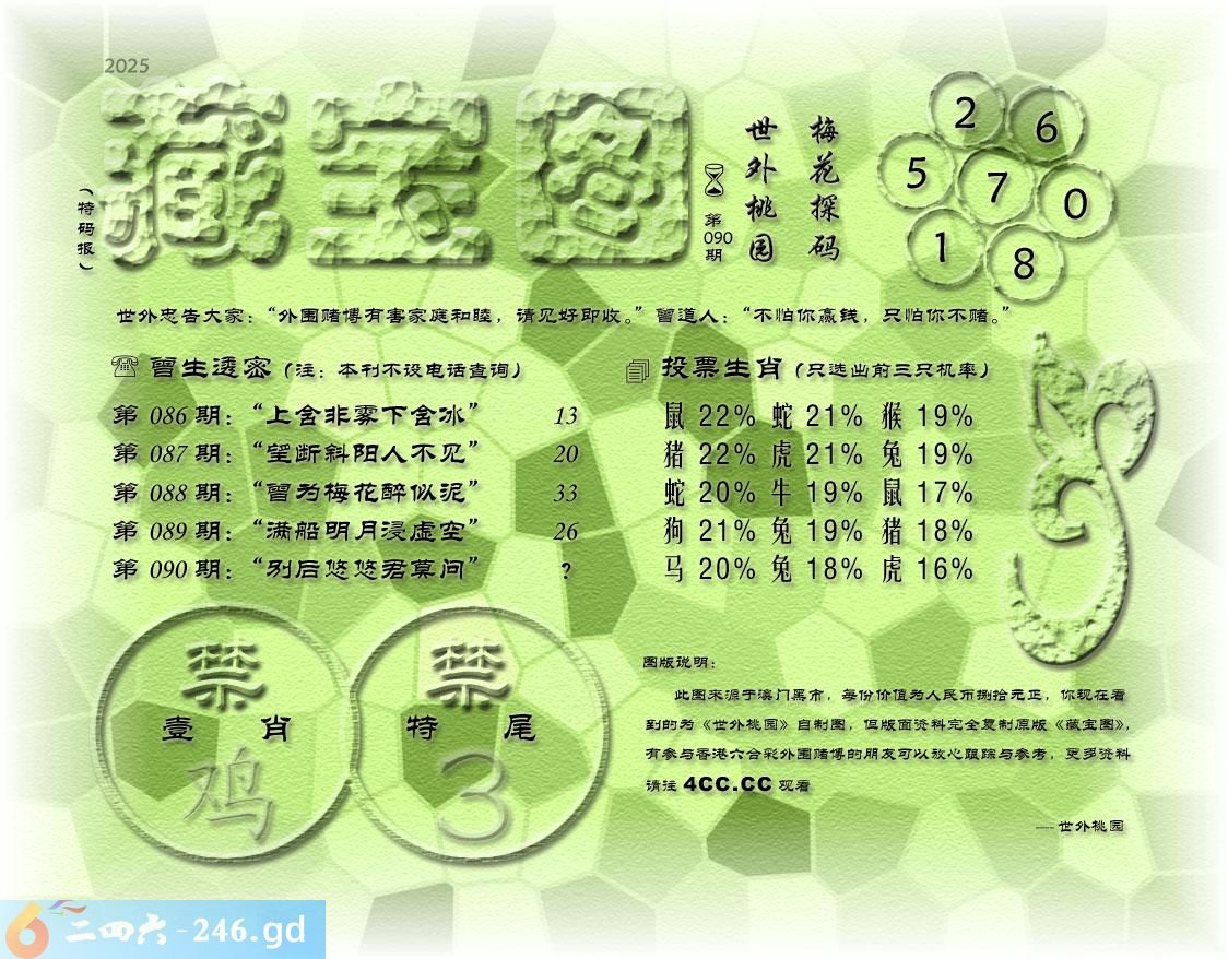 090期藏寶圖 新:虽近曲江居古寺 老:别后悠悠君莫问 禁:鸡 禁:3尾 玄機字:《绵》