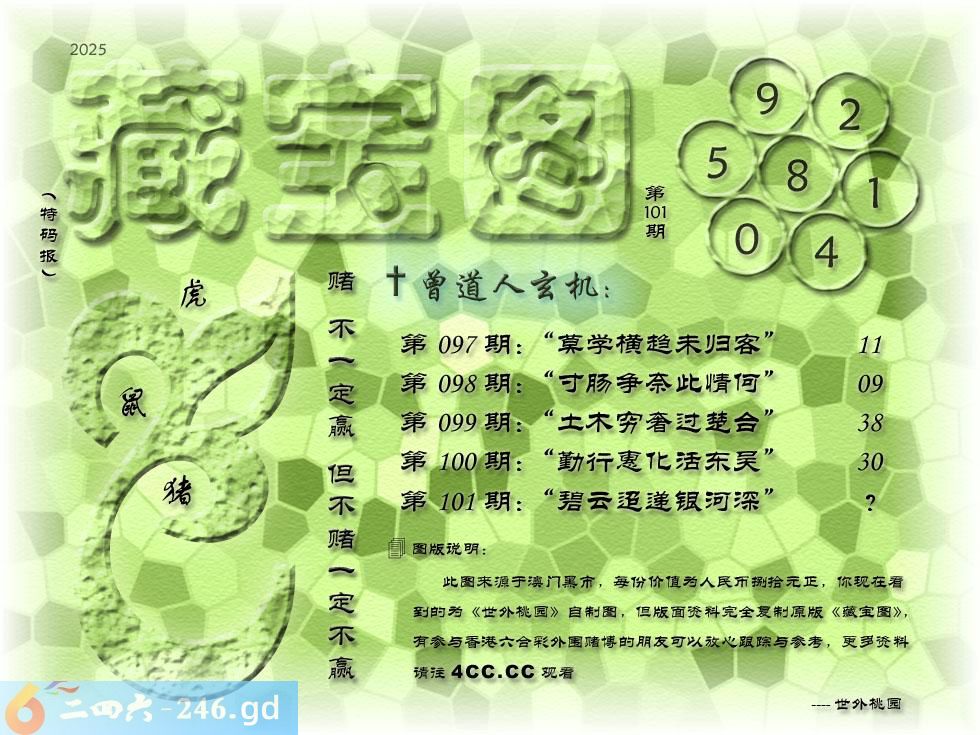 101期藏寶圖 新:碧云迢递银河深 老:蜀道如天夜雨淫 禁:蛇禁:7尾玄機字:《菟》
