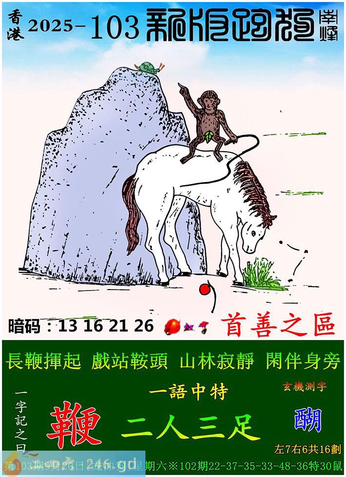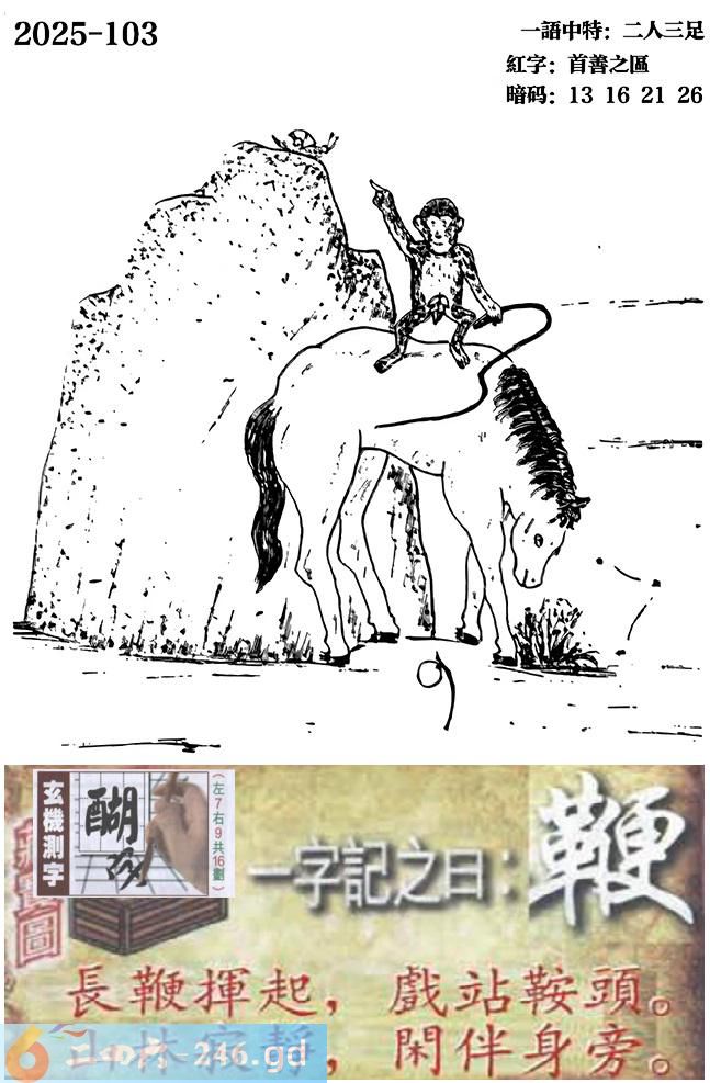 103期跑狗一字記之曰:【鞭】 長鞭揮起,戲站鞍頭。 山林寂靜,閑伴身旁。 玄機測字:《醐》 一語中特:二人三足