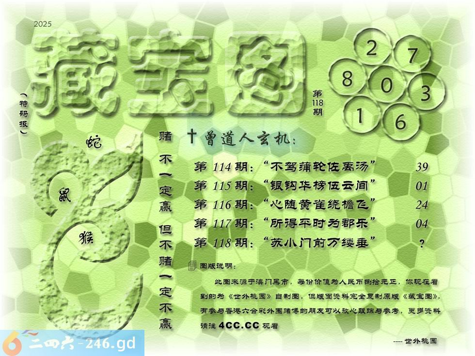118期藏寶圖 新:苏小门前万缕垂 老:伴人东去到江城 禁:羊 禁:5尾 玄機字:《存》