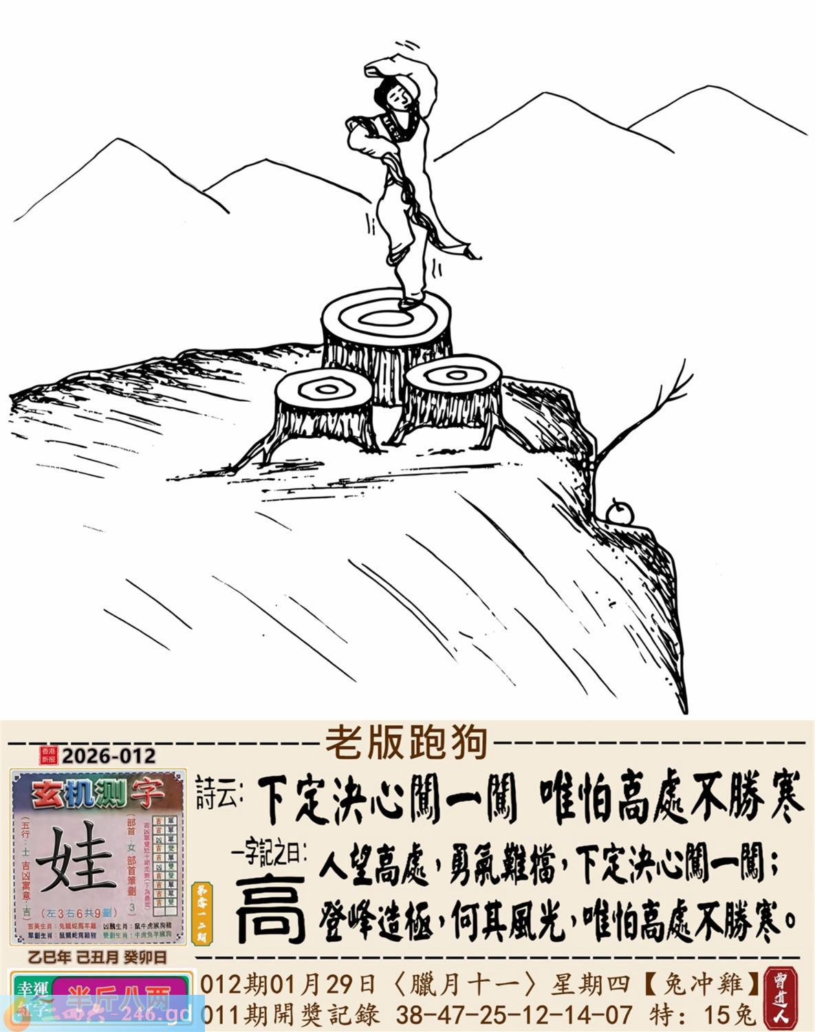 本帖最后由小歪于2026-1-2908:41编辑 2026年1月29日012期鸡(丁酉)(金箔金) 012期:老版跑狗玄機一字記之曰:【高】 詩云:下定決心闖一闖唯怕高處不勝寒 人望高處,勇氣難檔,下定決心闖一闖; 登峰造極,何其風光,唯怕高處不勝寒。 玄機測字:《娃》 密圖詩:竹藍打水一場空 《記》:八仙賀喜到門前 特碼大小單雙句:天天去市場買菜 今期必中:馬超 012期:特碼歇后語 祖奶奶的花鞋-----老式样 012期正版四字梅花诗:三天打鱼。 012期火车头:烧伤马。诗:马死兔伤,二九出特今期来。 012期香港第一手欲钱料:日本? 012期曾道人说:“三个?” 012期另版四字梅花诗:美丽神话。 012期香港第一手欲钱料:欲钱找2005年最后一期的开奖记录。 012期曾道人说:“恭贺大陆各位彩民在2005年的最后一期发大财”? 012期:二字經:多情 012期:二流子是特码 012期:智力金壤;左道旁门 012期:信箱紅字:【一錘定音】 012期:【暗碼:13-28-34-41】 012期:一語中特:【三頭六臂】 發財玄機圖:聞嗅探索警覺性強圖中明鼠紅藍 012期:藏寳圖 新:家在画桥堤下住 老:古来惟有酒偏香 禁:猴禁:9尾玄機字《读》 2026年012期【生活幽默】版 〖一個專養乳牛的牧場〗 一個專養乳牛的牧場,爲了維持牧場内牛衹的数量,在母牛群中放養了一衹公的乳牛。但是時間久了,這衹公牛也老了,開始有點力不從心,于是牧場的主人又買了一衹新的公牛來擔任維持牛衹數量的工作。至于那衹老公牛,由于過去数年來,它没有功勞也有苦勞,所以主人還是繼續放它在母牛群裹逍遥。有一天,主人去巡視牧場,看見老公牛氣喘嘘地趴在草地上。牧場主人走近説:你年紀大了就收斂一點,不要作這多。老公牛一臉無辜的説:你難道不能告訴那衹新來的,我不是母牛!